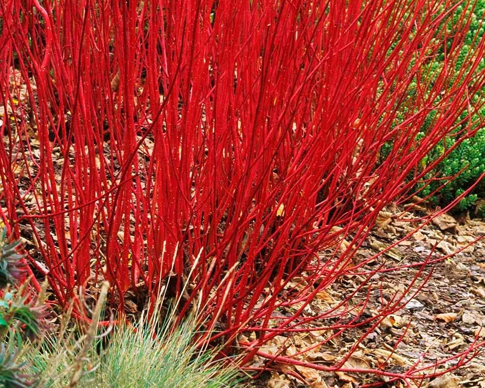 Цвет побегов дерена сорта Элегантиссима варьируется от бурого до насыщенного красного, благодаря чему кусты украшают сад даже зимой, в условиях дефицита ярких красок. Молодые побеги бледнее – они сначала имеют оливковый окрас, и лишь к осени кора приобретает красноватый оттенок.