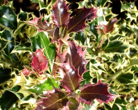 Листья -вариегатные, короткочерешчатые, продолговато-яйцевидные, до 7 см длиной, с волнистым краем и крупными, треугольными колючими зубцами (на старых деревьях — почти цельно-крайние). Молодые листья по краям украшены полосой малиново-розового цвета. Такой же цвет имеют и молодые побеги. К осени листва приобретает красивые фиолетово-розовые оттенки.