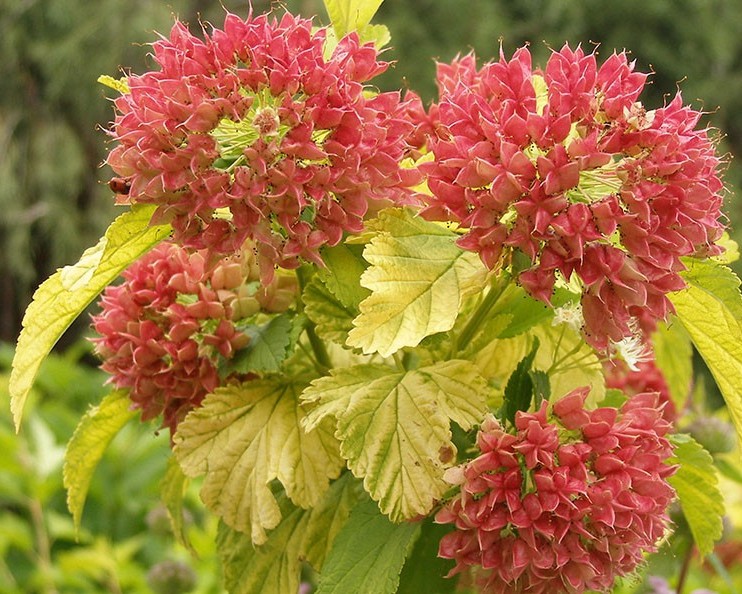 Пышные соцветия Лютеуса со множеством мелких бело-голубых или розоватых пятилепестковых бутончиков, имеющих множество тычинок, раскрываются в начале лета, и через месяц образуют плоды тюльпановидной формы. Из красноватых они постепенно превращаются в коричневые, чем контрастно отличаются от фоновой расцветки куста.