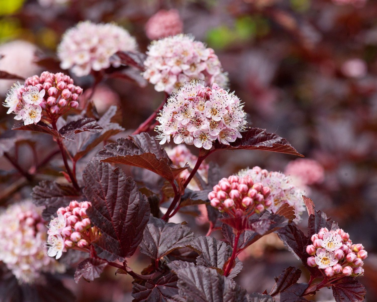 Цветение начинается в июне. Кустарник полностью усыпан мелкими соцветиями розового оттенка. Цветки большей частью собираются в небольшие полушаровидные скопления, диаметром достигают до 5 см. Эффектно смотрятся на ярко-бурой листве.