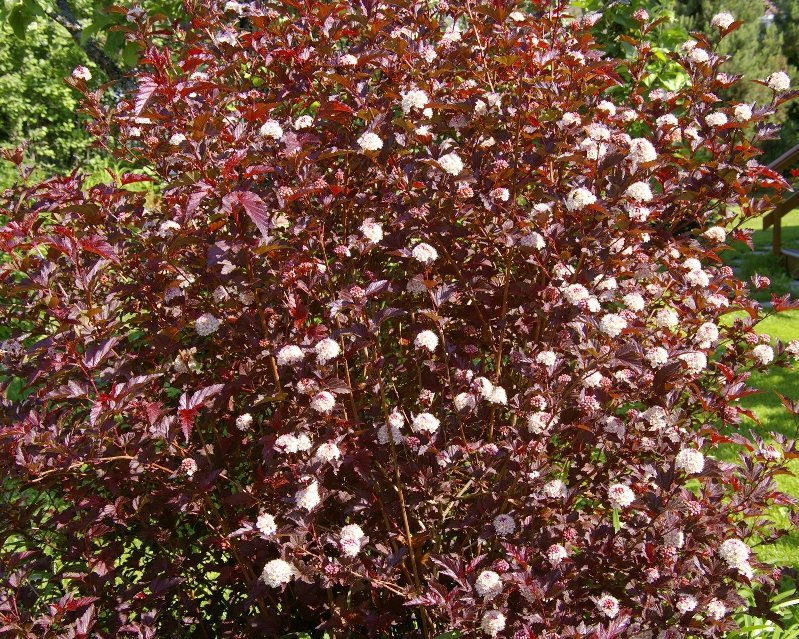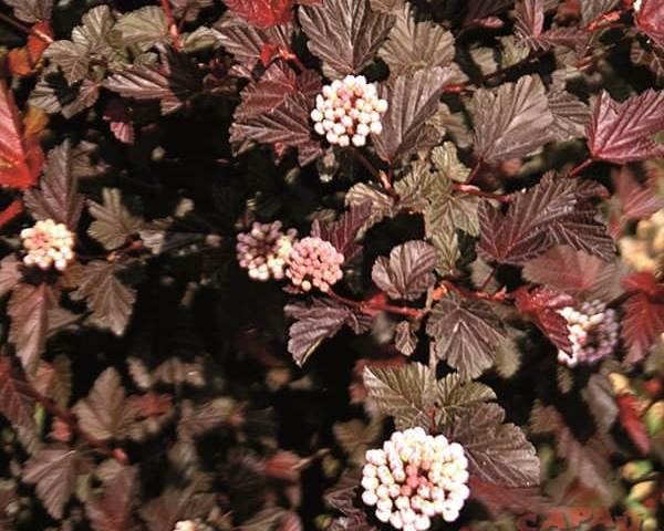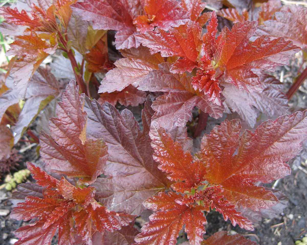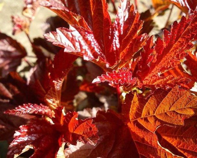 Очень любит солнечный свет, от его количества зависит цвет листьев. При его обилии получится ярко-бордовый колер. Величина варьируется от 1 до 1,5 м. Массивность куста определяется характером стрижки.Листва имеет овальные продолговатые размеры с зубчатым основанием цвета вишни. Молоденькие листочки бордово-красные, которые по мере взросления темнеют. Пластины представлены в виде 3-5 лопастей, соединенных между собой и похожих на лист клена.