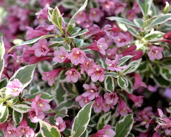 Цветы колокольчатые, появляются в мае-июне в 2-3 -цветковых соцветиях кистями на коротких боковых побегах. Бутоны обильны, насыщенного темно-розового цвета. Цветки среднего размера длиной до 2,5см. в диаметре, розового цвета, при отцветании темнеют. Не выцветают на солнце. Цветет с конца мая до середины июля, до 30 дней, и повторно выборочно с конца августа по сентябрь. Цветет на побегах прошлого года. Цветки хорошо посещаются бабочками и пчёлами – медонос.