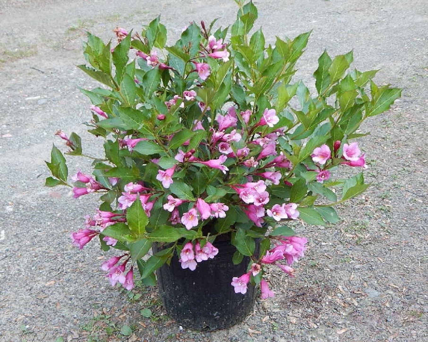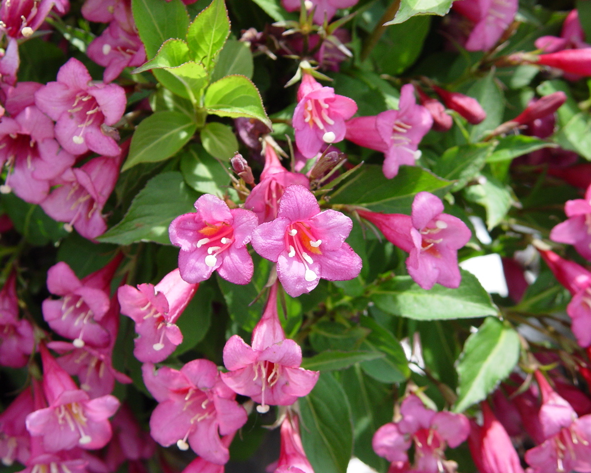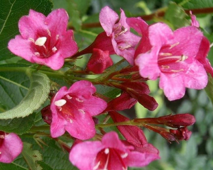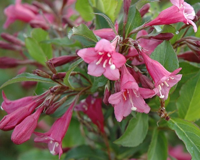 Цветы колокольчатые, появляются в мае-июне в 3-4-цветковых соцветиях кистями на коротких боковых побегах. Бутоны обильны, насыщенного лилового до темного розового цвета. Цветки длиной до 2,5см. в диаметре, темно-розовые или розово- сиреневые, бледнее внутри, при отцветании темнеют. Немного выцветают на солнце. Куст усыпан весь этими колокольчиками, и цветение вейгелы бывает за сезон два раза, правда, очень обильно этот кустарник цветет в первый раз весной, а вот потом, если угодить вейгеле, подкормить ее, то она снова зацветет в начале осени, но менее обильно. Цветет на побегах прошлого года. Цветки хорошо посещаются пчёлами – медонос.