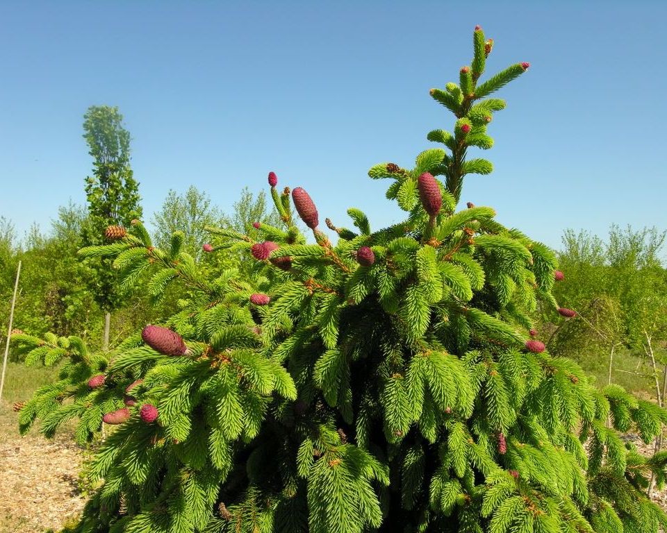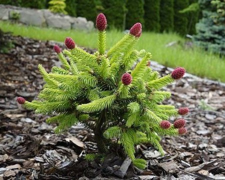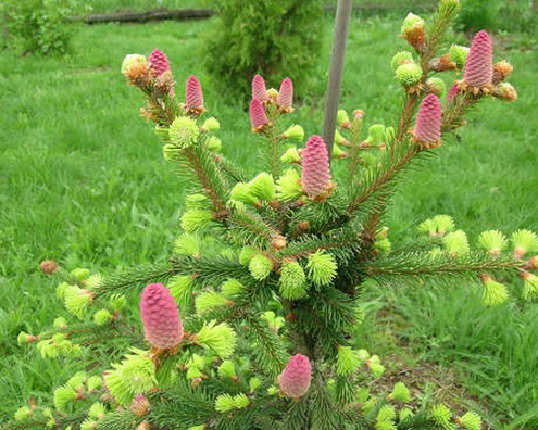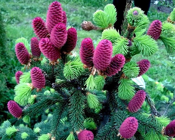 Представленная разновидность имеет симпатичные крупные цилиндрические красные шишки даже в молодом возрасте, особенно красиво они смотрятся на фоне темно-зеленой хвои в весеннее время. Для сорта характерно необычное расположение шишек – они всегда находятся на кончиках побегов. При образовании шишки развитие ветви в этом сезоне останавливается. Постепенно из пурпурного цвет шишек превращается в светло-коричневый.