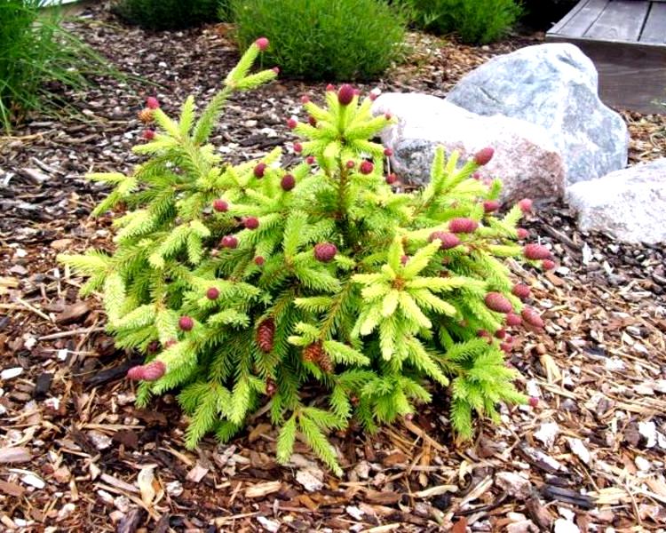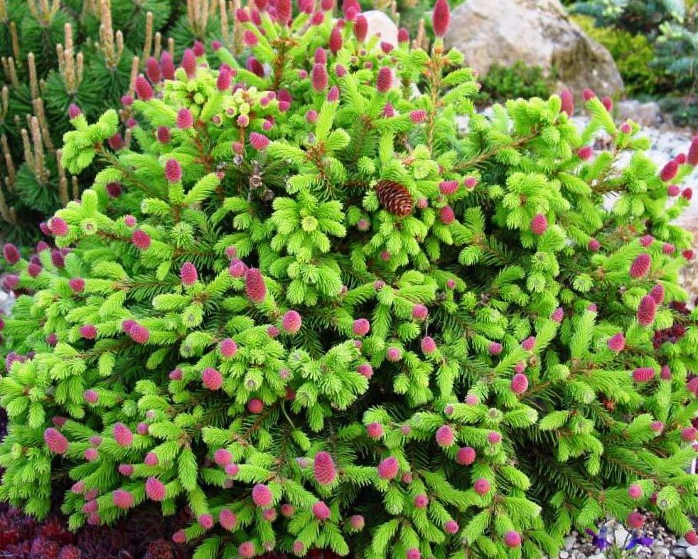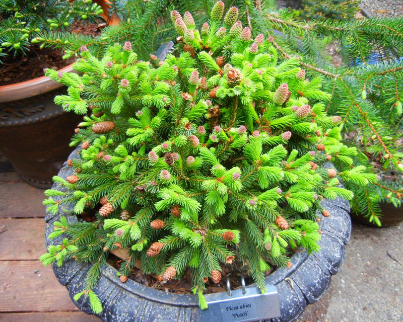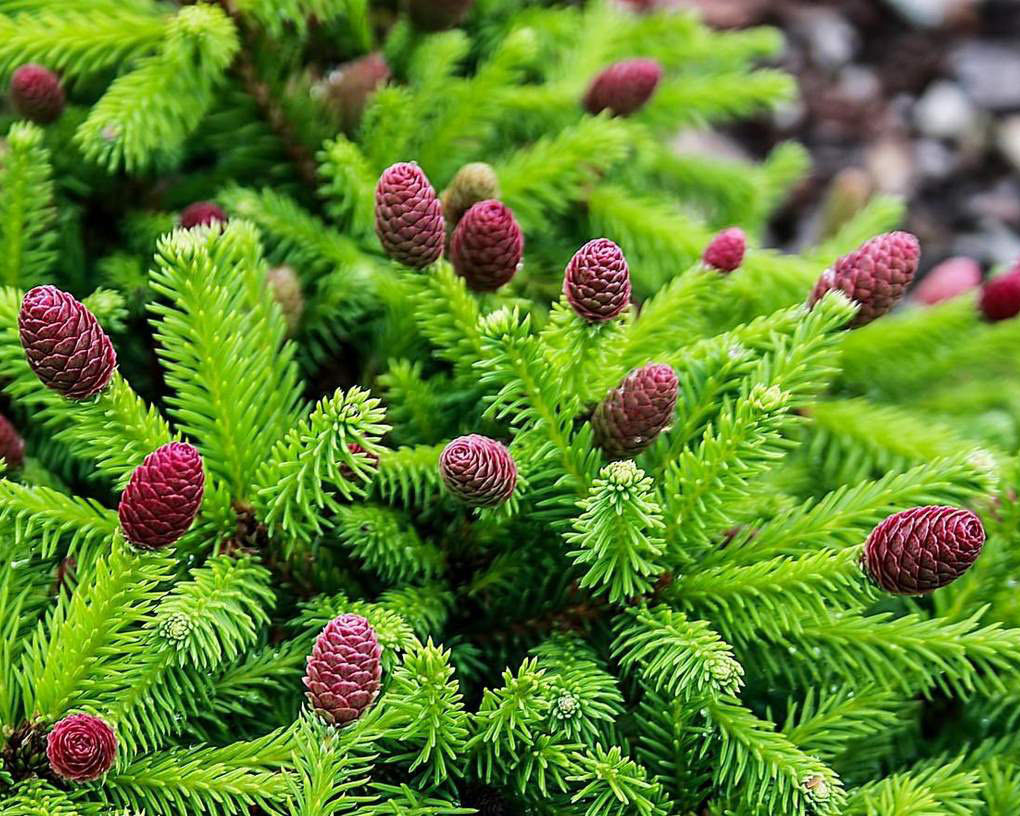 Красные шишки этого хвойного дерева напоминают маленькие красные веретёна. Ель Pusch отлично вписывается в любой ландшафт. Его можно сажать, как одиночное растение, так и в групповых посадках.