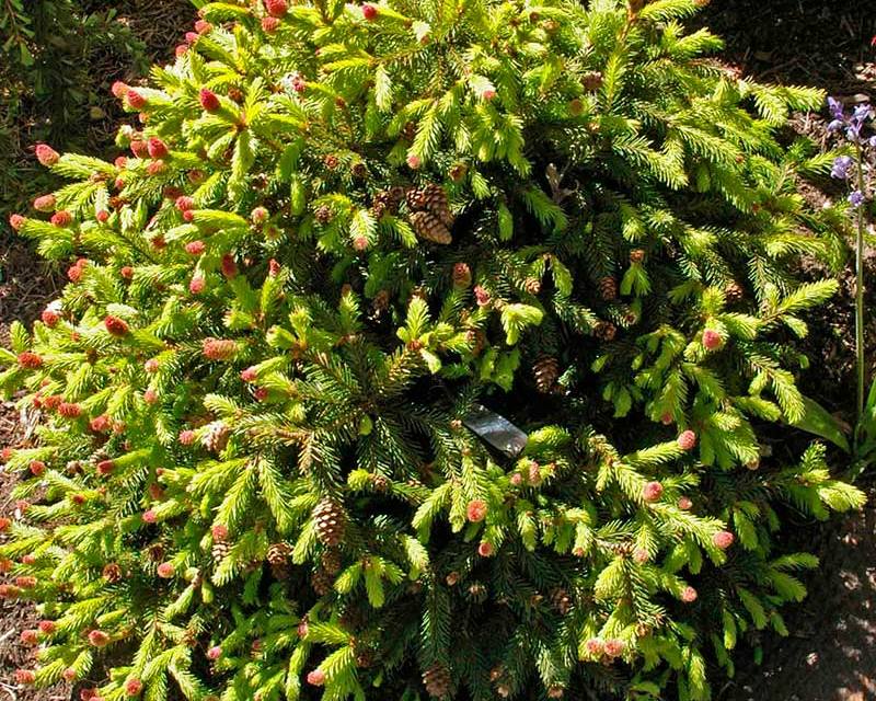 Этот сорт можно назвать карликовым. Стандартный размер взрослого двадцатилетнего дерева составляет до 1 м в высоту и столько же в ширину. В десятилетнем возрасте она не выше полуметра в высоту и имеет приблизительно такую же ширину. Растёт она довольно медленно (её годичный прирост достигает не более 7 см). Развивается ёлка довольно асимметрично, что совершенно её не портит, а наоборот придаёт ей не совсем обыкновенный вид. Асимметричное расположение веток ели делает её довольно привлекательным растением для ландшафтного дизайна. Воистину удивительным и неповторимым это растение делают уникальные шишки. Во время цветения (зацветают ели примерно с шестилетнего возраста) их шишки приобретают экзотические оттенки розового, малинового или красного цветов. Созревая, они становятся фиолетовыми, а к середине лета — коричневыми. Особенно хорошо необычные шишки смотрятся на фоне ярко-зелёного цвета хвои. В период цветения дерево выглядит очень эффектно и привлекательно.