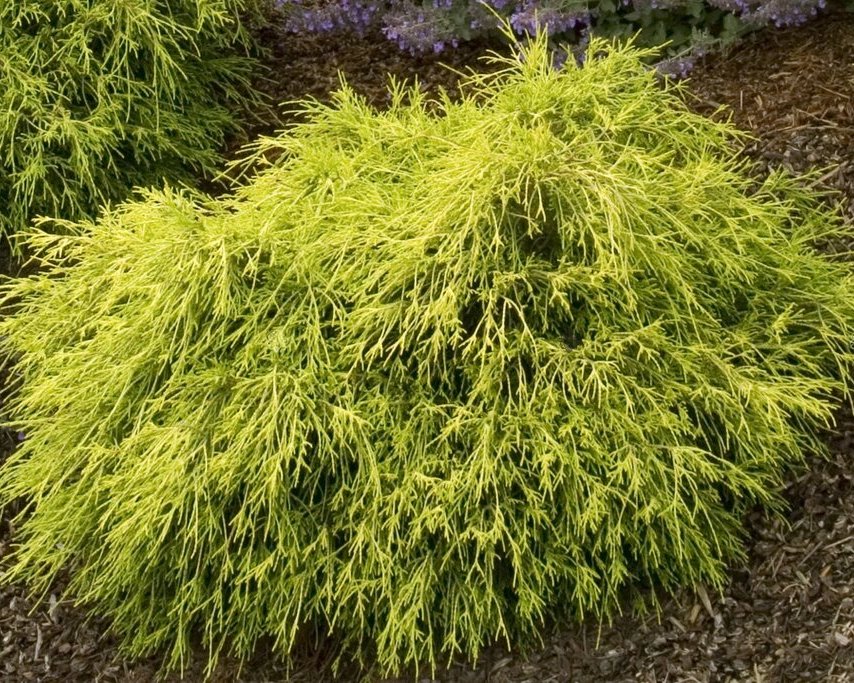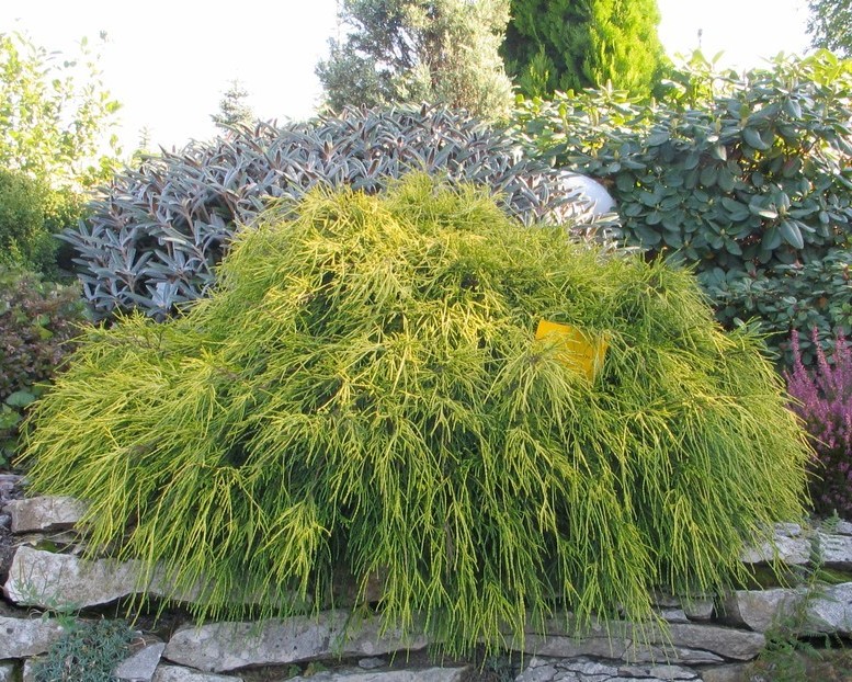 Побеги растения тонкие. Растут густо, плавными дугами спускаясь к земле. Хвоя светло-салатового оттенка с золотым блеском.