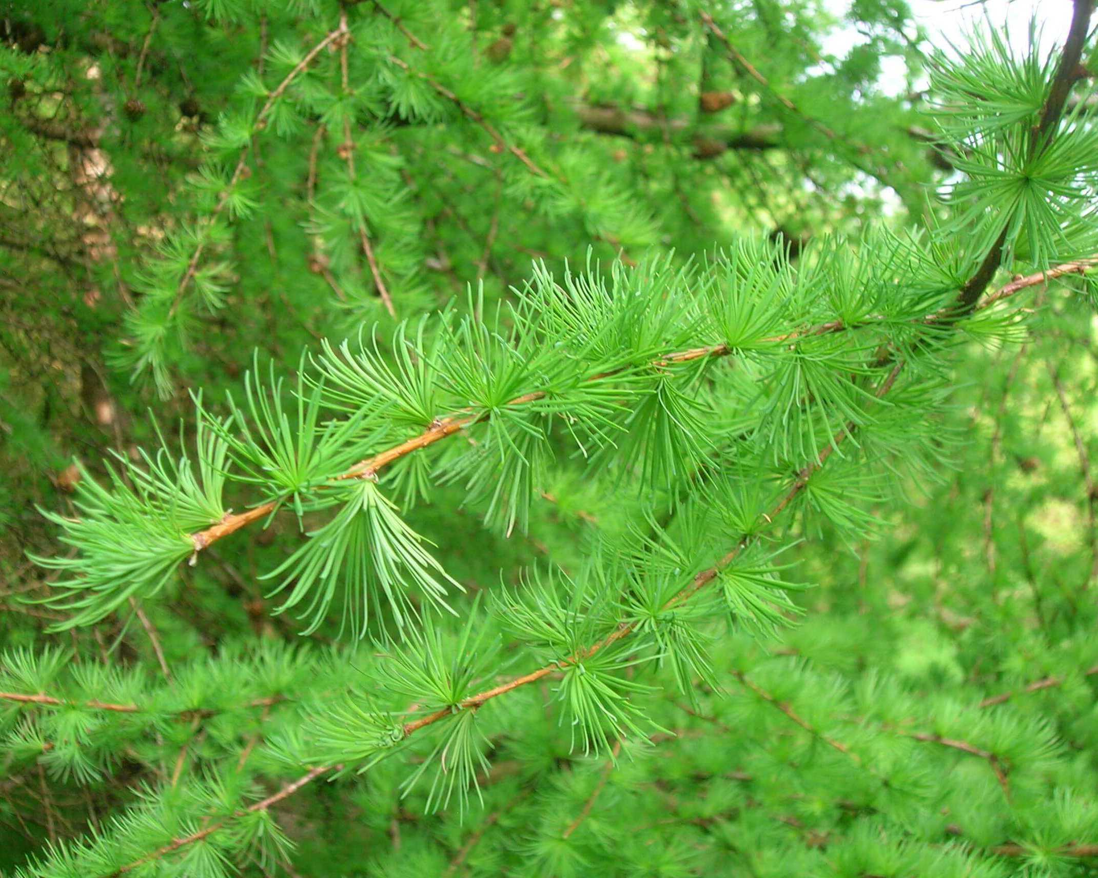 Хвоя этой лиственницы насыщенного зеленого цвета, плоская, очень гибкая, длинной до 3 сантиметров, она собрана группами по 40 штук на самых укороченных ветвях.