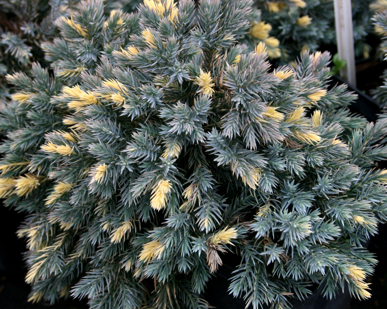 Международное латинское наименование можжевельника — Juniperus squamata ‘Golden Flame’. Название переводится как «Золотое пламя». Кустарник вырастает до параметров 1х1,5–2,5 м; ежегодный прирост составляет около 20 см. Крона широкая, раскидистая, ветви направлены под углом вверх. Хвоинки растут густо, игольчатой формы, окрашены в голубовато-зеленый цвет. Некоторые участки хвои имеют светлый кремовый оттенок. Шишкоягоды округлые, маленькие, черные или темно-синие с блестящей поверхностью. Корневая система разветвленная, поверхностного типа.