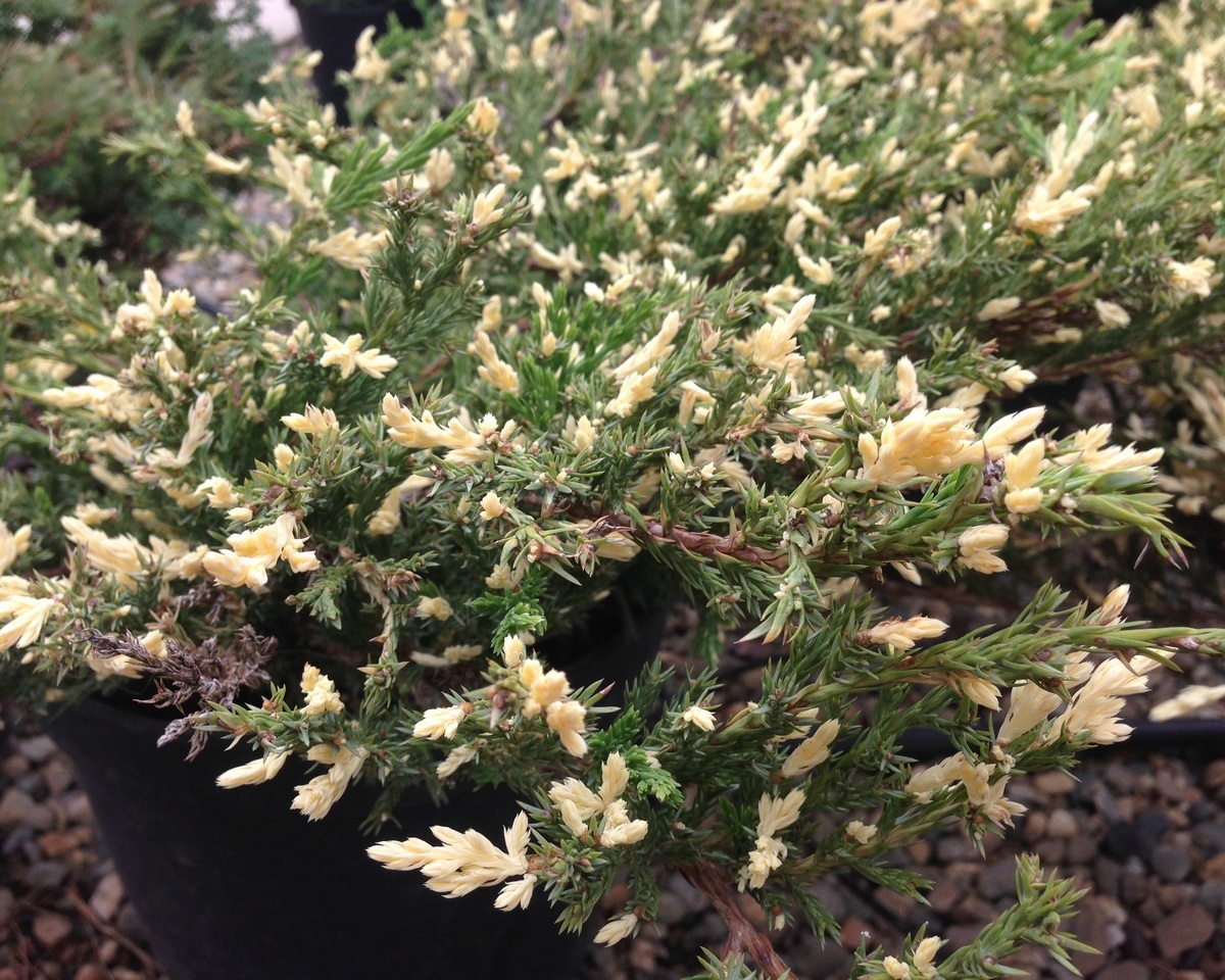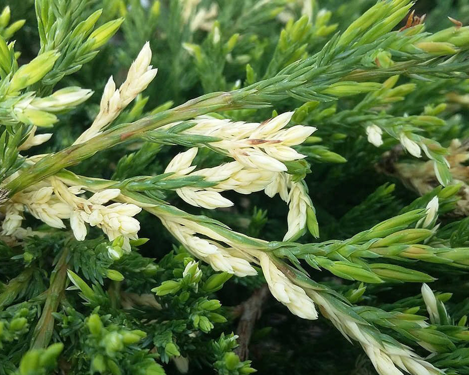 Хвоинки Андорры Вариегаты короткие, чешуйкоподобные, серовато-зеленого окраса. Молодые побеги имеют беловатый, кремовый цвет, который сохраняется очень долго. На зиму хвоя меняет окраску, приобретая фиолетовый оттенок. Шишкоягоды малозаметные, голубовато-белого окраса, поэтому внешне сливаются с молодым приростом.