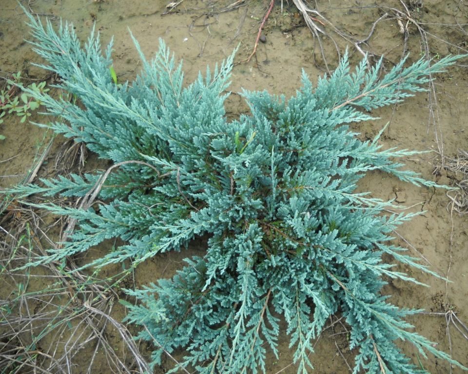 Латинское наименование разновидности — Juniperus horisontalis Blue Chip. Размер взрослых экземпляров в ширину составляет 1,2-1,5 м, в высоту 0,2-0,3 м, может достигать 0,5 м. Стелющийся кустарник разрастается в виде звезды. Побеги стелются по земле, кончики слегка приподняты. Хвоинки небольшие, длиной 0,3-0,5 см, плотные, колючие, серебристо-голубого окраса. Шишкоягоды окружностью до 0,6 см, почти черного цвета.