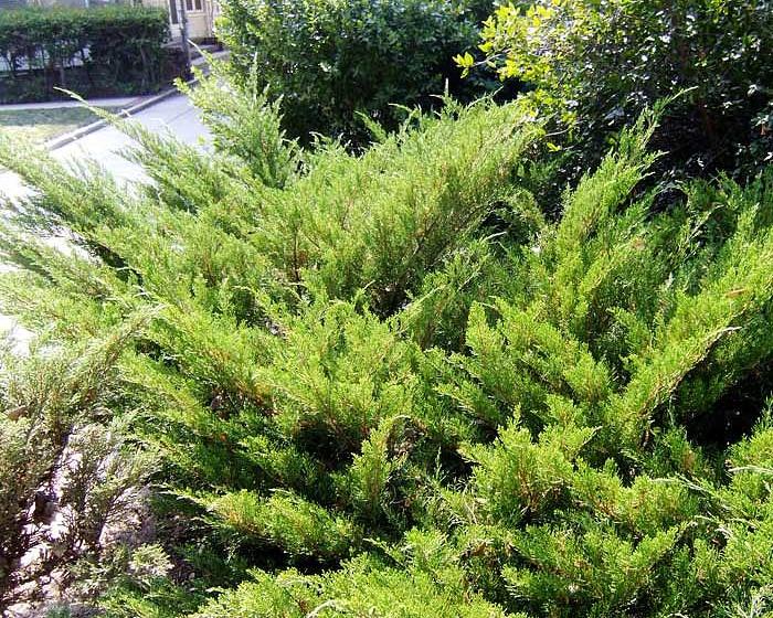 Международное латинское наименование можжевельника – Juniperus Sabina Mas. Крона широкая, раскидистая, голубовато-зеленого цвета летом, с пурпурным отливом зимой. Параметры взрослых экземпляров в пределах 1,5-2х3-5 м, годовой прирост зависит от условий выращивания, в среднем составляет 10 см. Кора красновато-коричневого окраса, веточки приподняты, концы молодых побегов немного опущены вниз. Хвоинки в основном игольчатые, плотные, прямые, заостренные, сверху имеют голубоватый оттенок, снизу зеленые.
