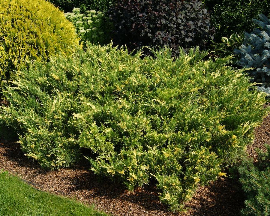 Международное латинское наименование сорта – Juniperus sabina Variegata. Компактный кустарник отличается небольшим размером по сравнению с другими представителями казацкого можжевельника. В высоту кустик достигает 1 м, по диаметру крона разрастается до 1,5 м. Растет медленно, годовой прирост составляет не более 8 см.