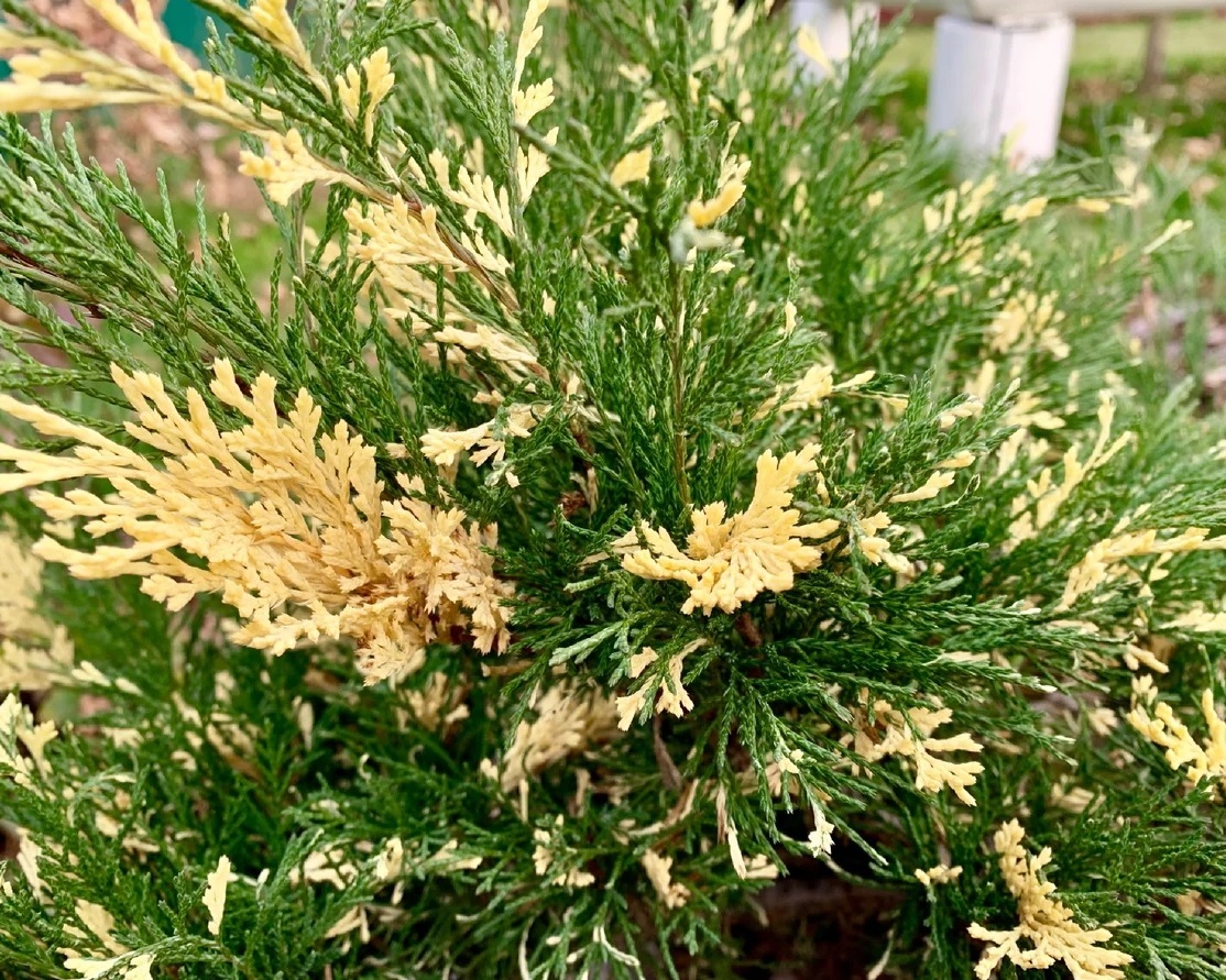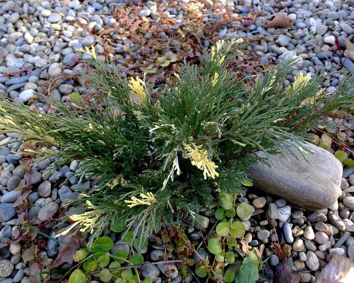 Надземная часть распростертая, Вариегата формирует плотный покров из приподнимающихся побегов с изогнутыми верхушками. Хвоя серовато-зеленая, но молодые кончики окрашены в кремовато-белый цвет, что создает пеструю окраску. Иголочки чешуеподобные, короткие. Шишкоягоды малозаметны, вызревают на 2-й год.