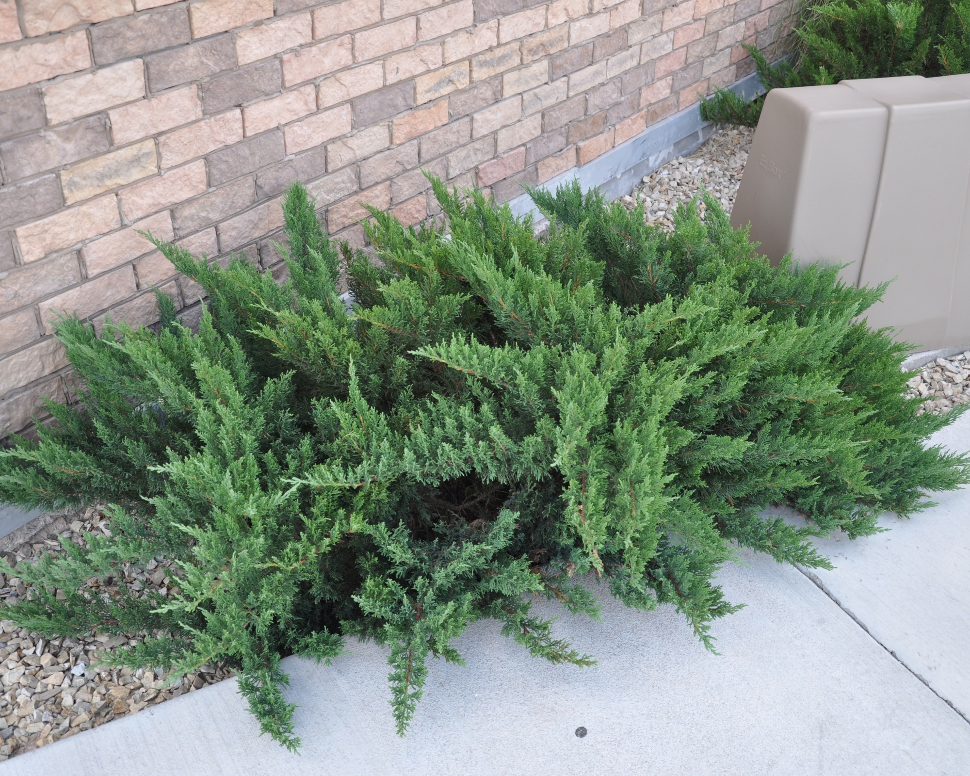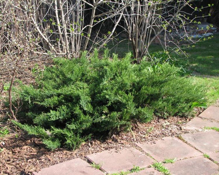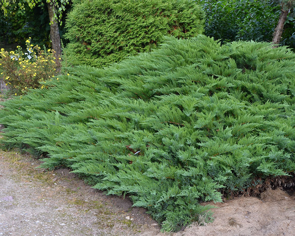 Побеги растения отходят от ствола горизонтально, слегка наклоняясь к земле и образуя купол. На скелетных ветвях расположены тоненькие побеги, растущие вверх. Такое строение куста придает можжевельнику пышности и объема. Веточки покрыты короткой игольчатой хвоей насыщенного изумрудного цвета. На взрослых экземплярах ежегодно нарастают плоды – шишкоягоды синего цвета с синеватым налетом.