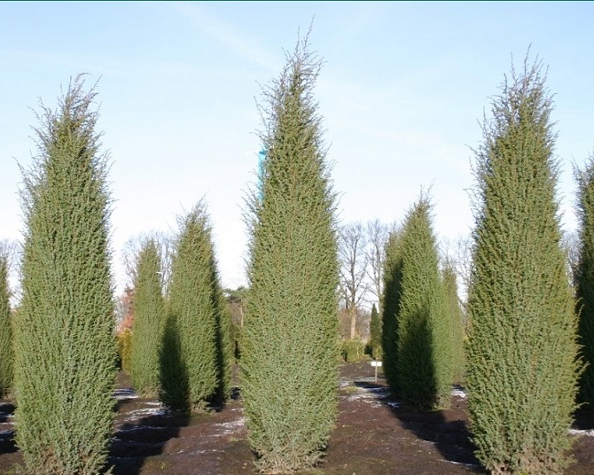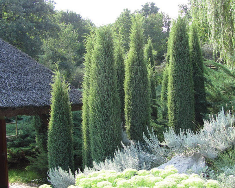 Можжевельник Хиберника нередко сажают вдоль дорожек сада, аллей. Эффектно смотрятся рядом с ним:
