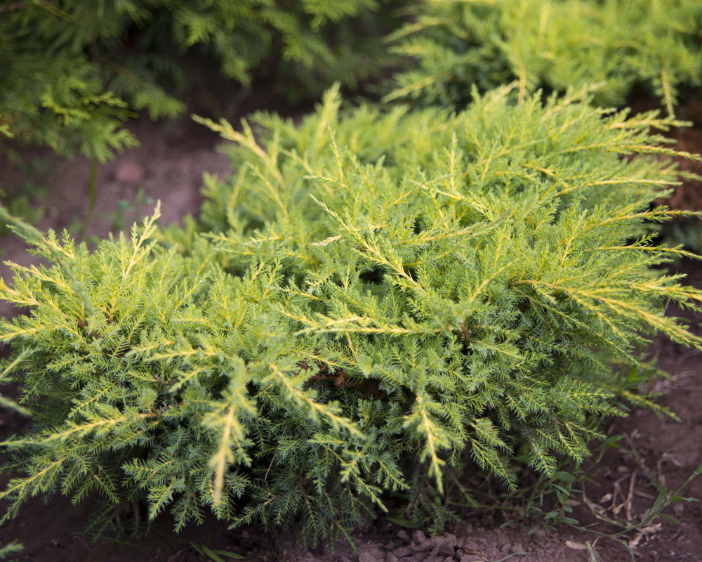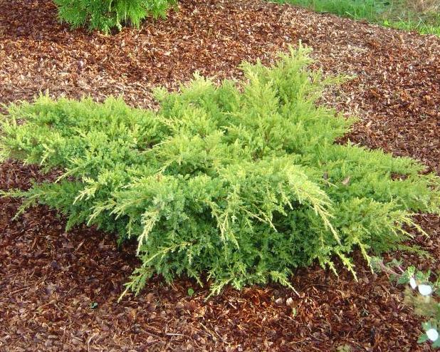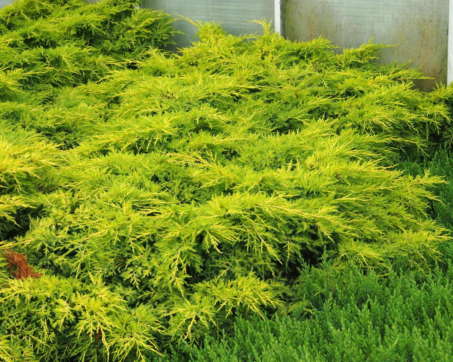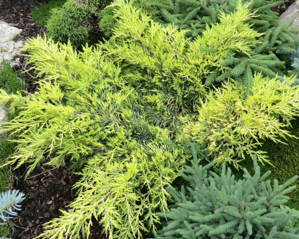 Латинское наименование – Juniperus media Gold Star, синонимы вида – Пфитцериана, китайский. Название полностью отражает внешний вид кустарника, окрас и форма кроны действительно напоминают большую золотую звезду. В центре растение образует небольшой стволик, от которого отходят побеги. Параметры взрослого кустика составляют в диаметре 2-2,5 м, в высоту до 1 м. Хвоинки игольчатые и чешуевидные, золотисто-желтого окраса, ближе к центру зеленоватого оттенка.