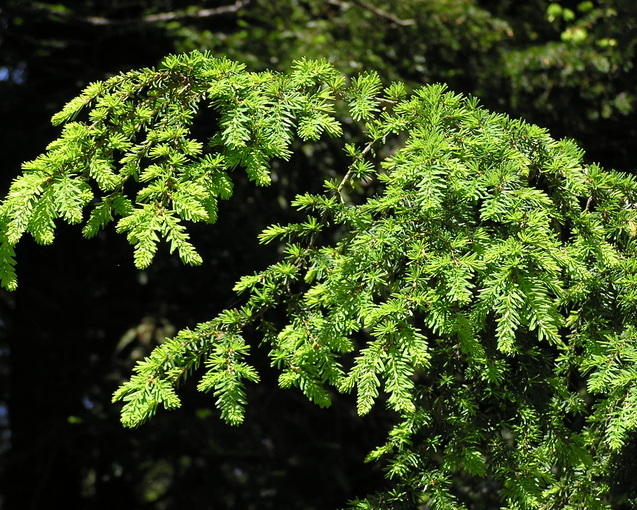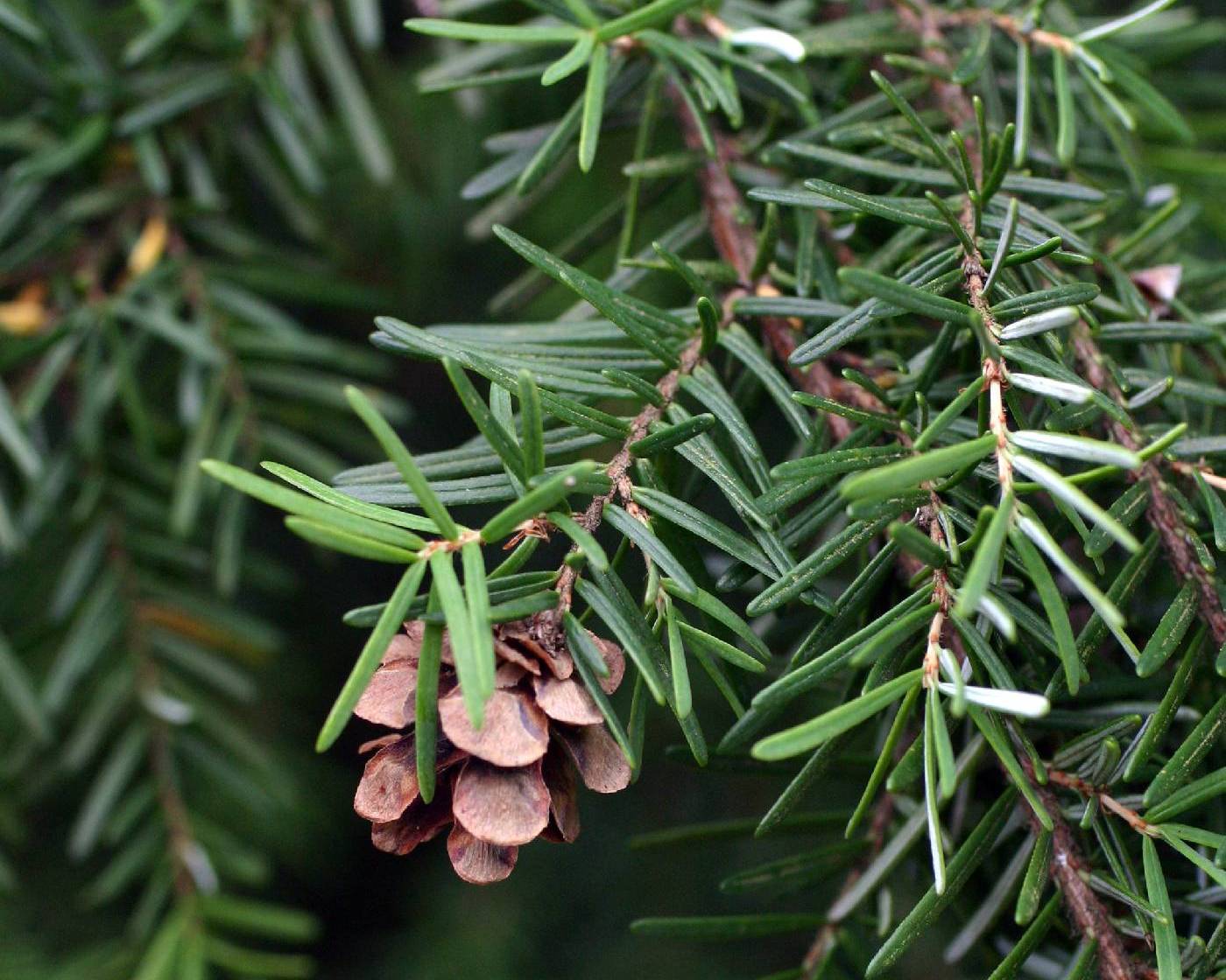 Иголки линейные с нежнозазубренным краем и тупозакругленным, всегда без выреза концом, сверху блестящие, темно-зеленые или морщинистые, снизу с 2 белыми устьичными каналами по 7—8 линий, с тонким зеленым краем.