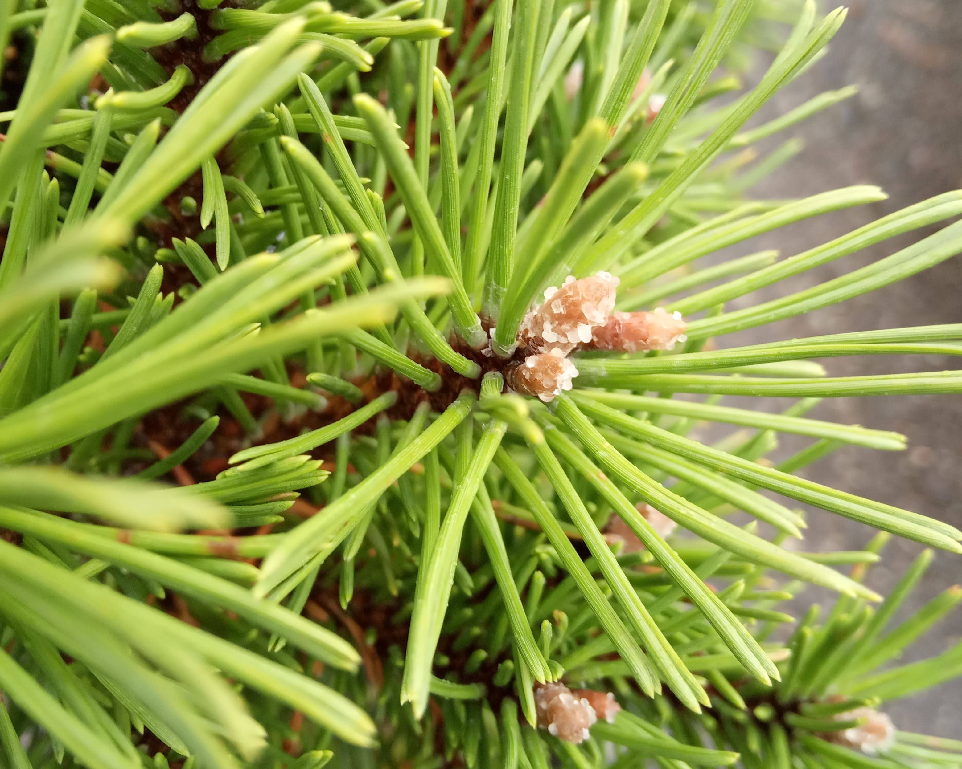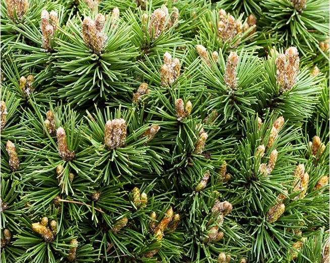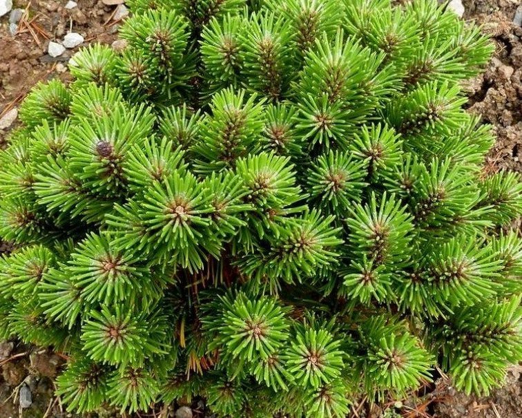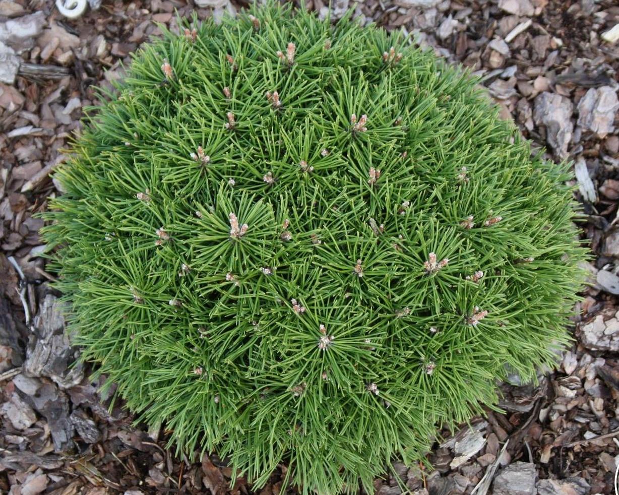Хвоя растения собрана в небольшие пучки по 2 иголки, каждая из которых вырастает до 5 см в длину. Все они жёсткие на ощупь, молодые приросты — яркие, насыщенного зелёного цвета, в то время как более старые имеют тёмно-зелёный окрас, но при такой же блестящей поверхности. Светло-коричневые шишковидные плоды яйцевидной формы всегда небольшого размера, длиной около 4 см. Они ничуть не портят внешний вид растения, поэтому даже при плодоношении взрослых сосен их красота не угаснет.