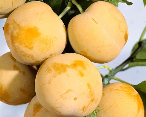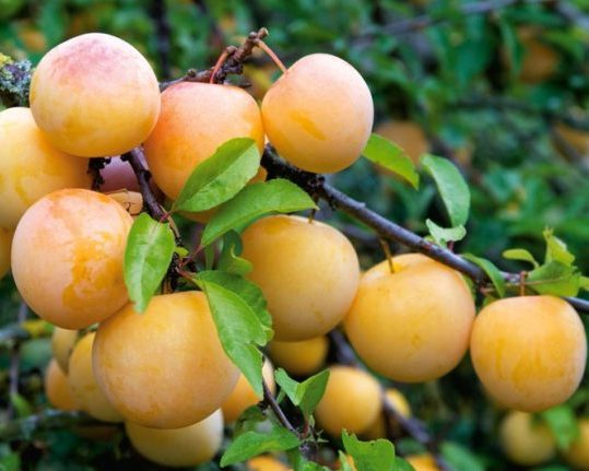 Плоды Медовой белой сливы крупные от 30 до 50 грамм, с толстой кожицей желтого цвета с белым налетом средней интенсивности. Плоды очень напоминают алычу, но это совершенно разные культуры. Спелые ягоды сливы имеют слегка оранжевый румянец. Формы плодов полуогкруглые — грушевидные, в большей степени — овальные. Их правильная форма позволяет проводить транспортировку без большого процента потери. Толстая кожица предотвращает чрезмерное растрескивание и битость плодов. Косточка внутри ягоды некрупная, легко отделяющаяся, округлая, приплюснутая.Зацветает слива в мае, весь месяц продолжается цветение и опыление, затем завязываются плоды. Уже в июле можно собирать урожай Медовой белой сливы. Приятно отметить, что урожай сливы стабилен в любых климатических и погодных условиях. Даже в северных районах или при сильных перепадах температуры дерево формирует дружный богатый урожай плодов крупного размера и отличного вкуса.Мякоть отличается приятным вкусом с медовыми нотками, сладкая, но не приторная.