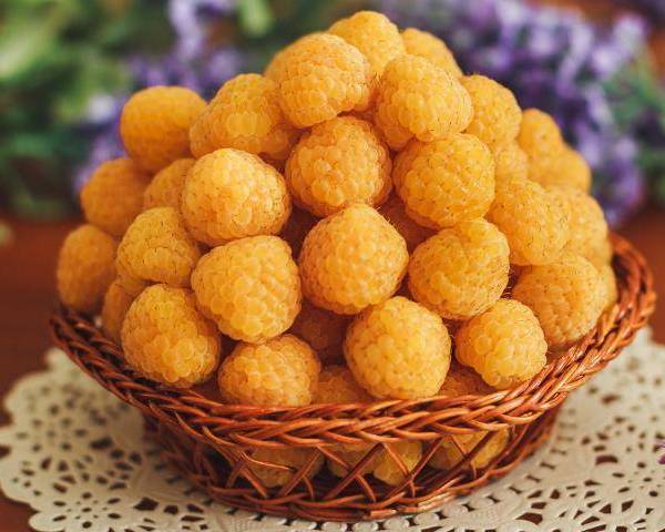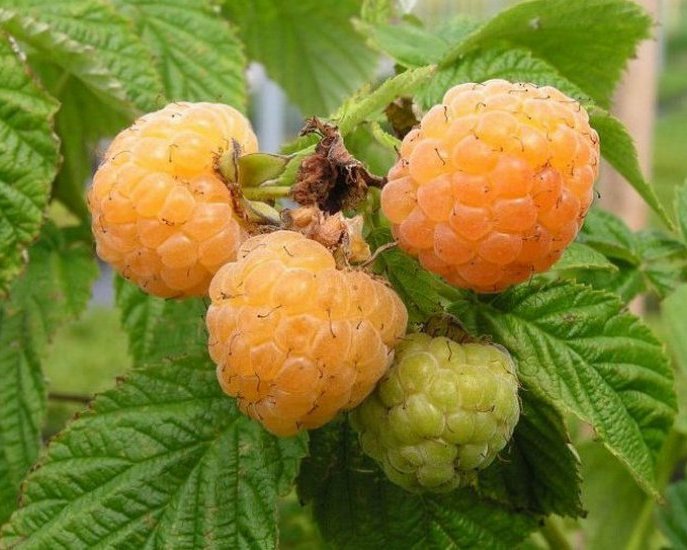 Побеги прямостоячие 1,3 — 1,5 м средней ветвистости, раскидистые. Ростков в первой год мало. Они светло — зеленой окраски, с легкой опушкой и восковым налетом. А двухгодичные — с нежно — коричневой корой. Плоды желтого цвета, если переспевают, становятся абрикосовыми. Ягоды с 3,8 г., с полушаровидными формами, небольшой опушкой на коротких плодоножках. Они не аллергичны, поэтому их спокойно потребляют дети и будущие мамочки. Ягодки со сладковато — кислым привкусом, не похожи на привычный малиновый вкус. Ягоды отлично подходят для транспортировки. Культура имеет стойкий иммунитет к заболеваниям.
