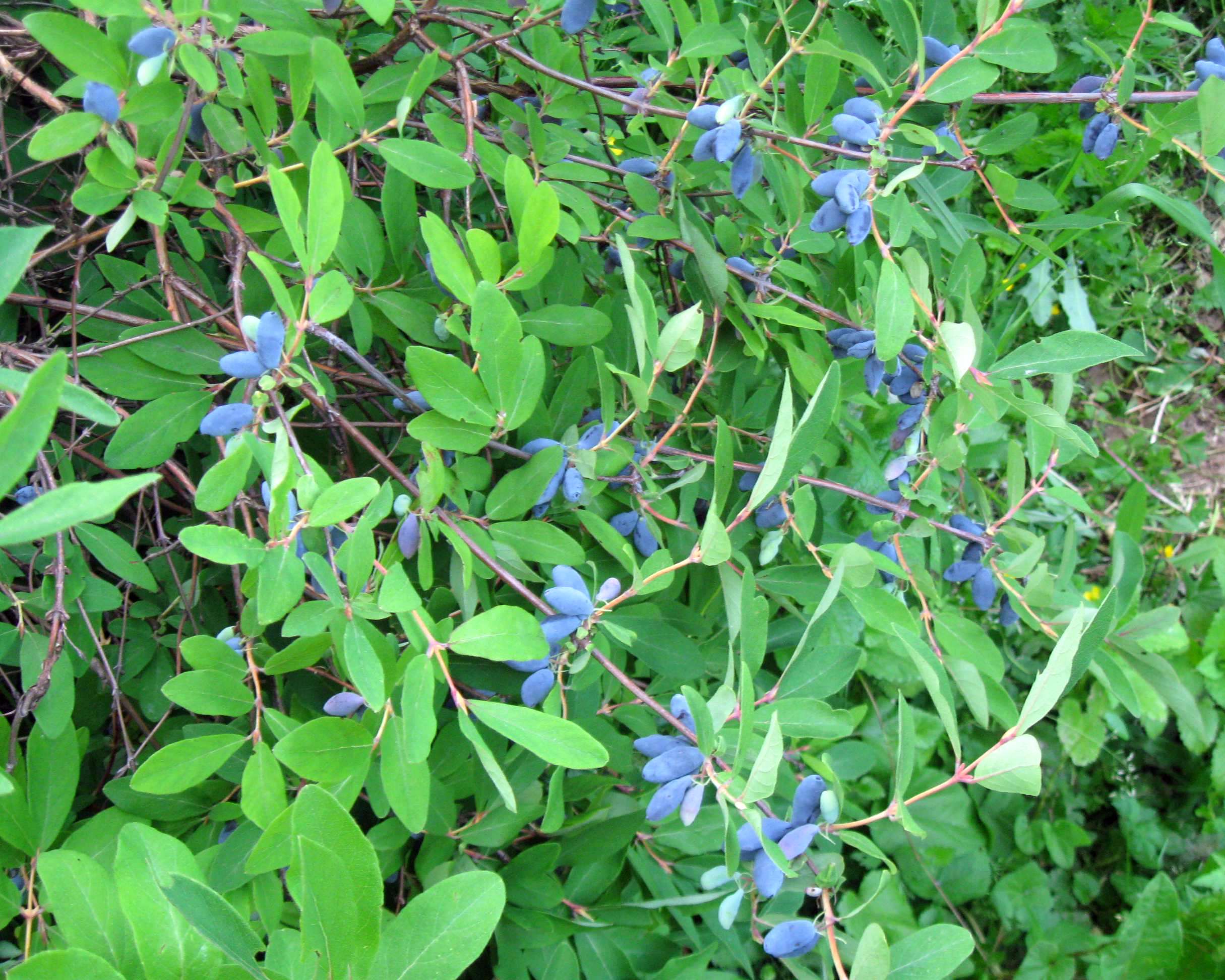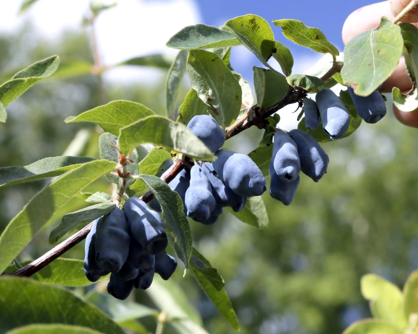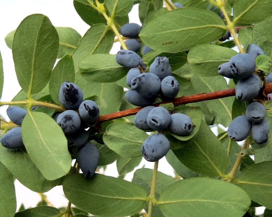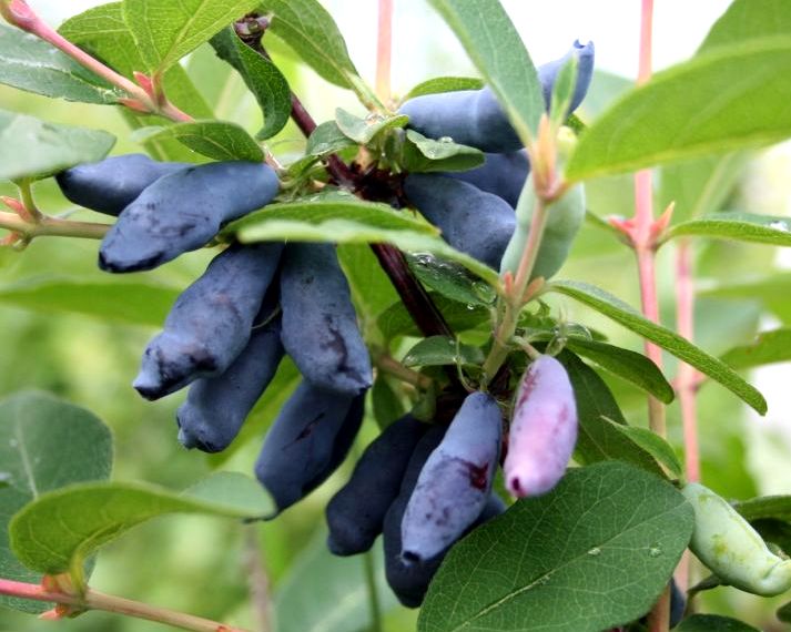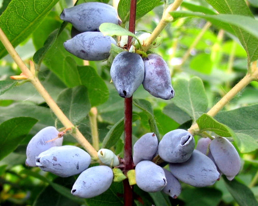 Съедобные ягоды имеют тёмно-синюю, почти фиолетовую окраску и восковое белёсое напыление поверх кожицы. У плодов вытянутая, чуть грушевидная форма, их длина достигает почти 1,5 см, а масса — от 0,8 до 1,2 г. Покрытие ягод крепкое, гладкое, мякоть сочная, с десертным кисло-сладким вкусом. Плоды легко снимаются с веток, при отделении не возникает повреждения кожицы, что очень важно для длительной сохранности ягод.