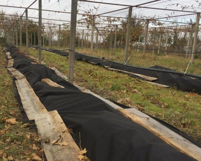 - накрыть белым укрывным материалом, сложенным вдвое так, чтобы он лежал рыхлым слоем. Белый цвет защищает кусты от ожогов, а рыхлый слой спанбонда поддерживает постоянную температуру;